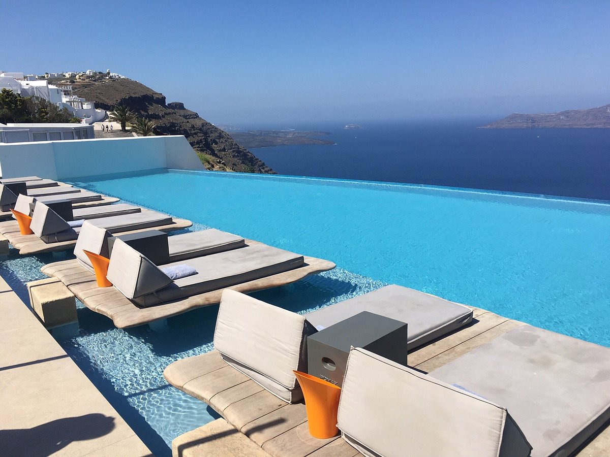 - Infinity pool with panoramic caldera views