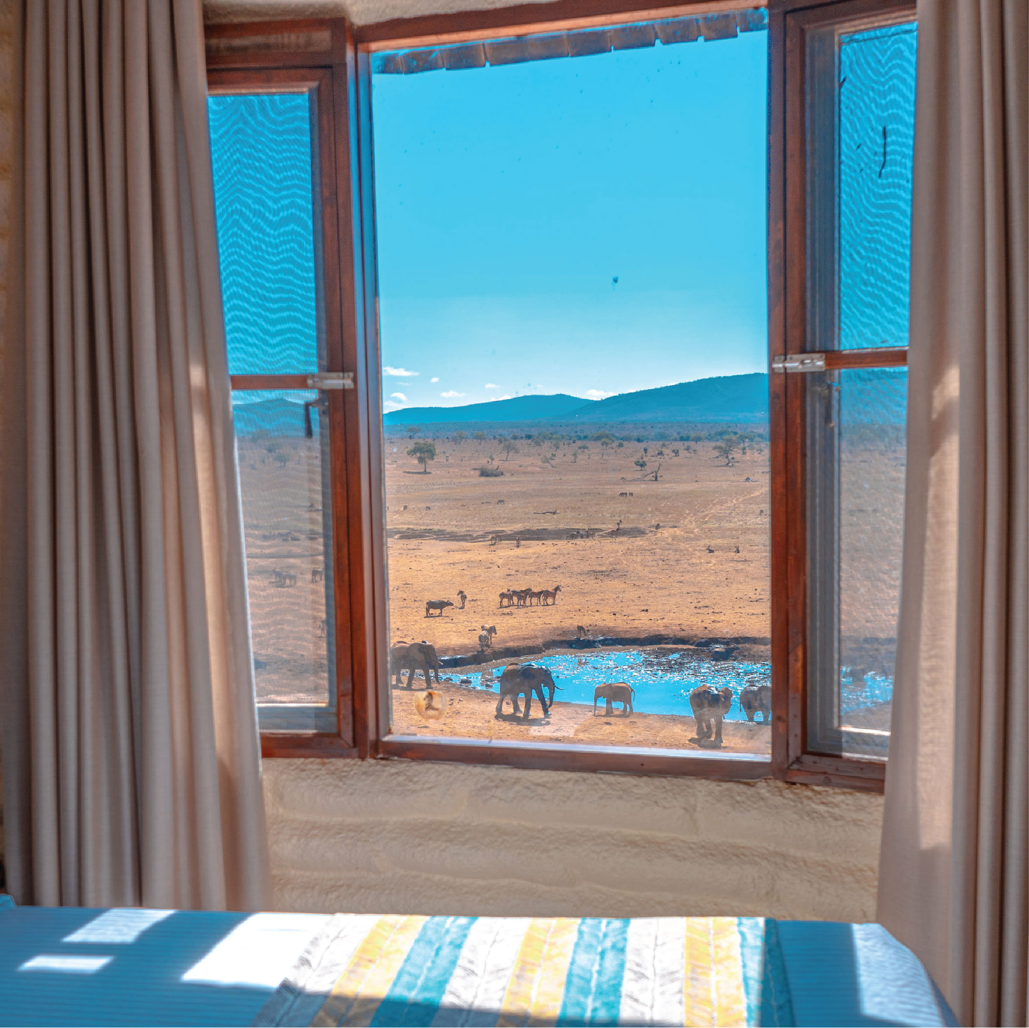 From the comfort of your elevated suite, watch herds of elephants, buffalos, and antelopes gather below, their silhouettes glistening in the golden African light. At night, lanterns glow softly over the savannah as wildlife silently roams beneath your feet — a dreamlike experience found only here.