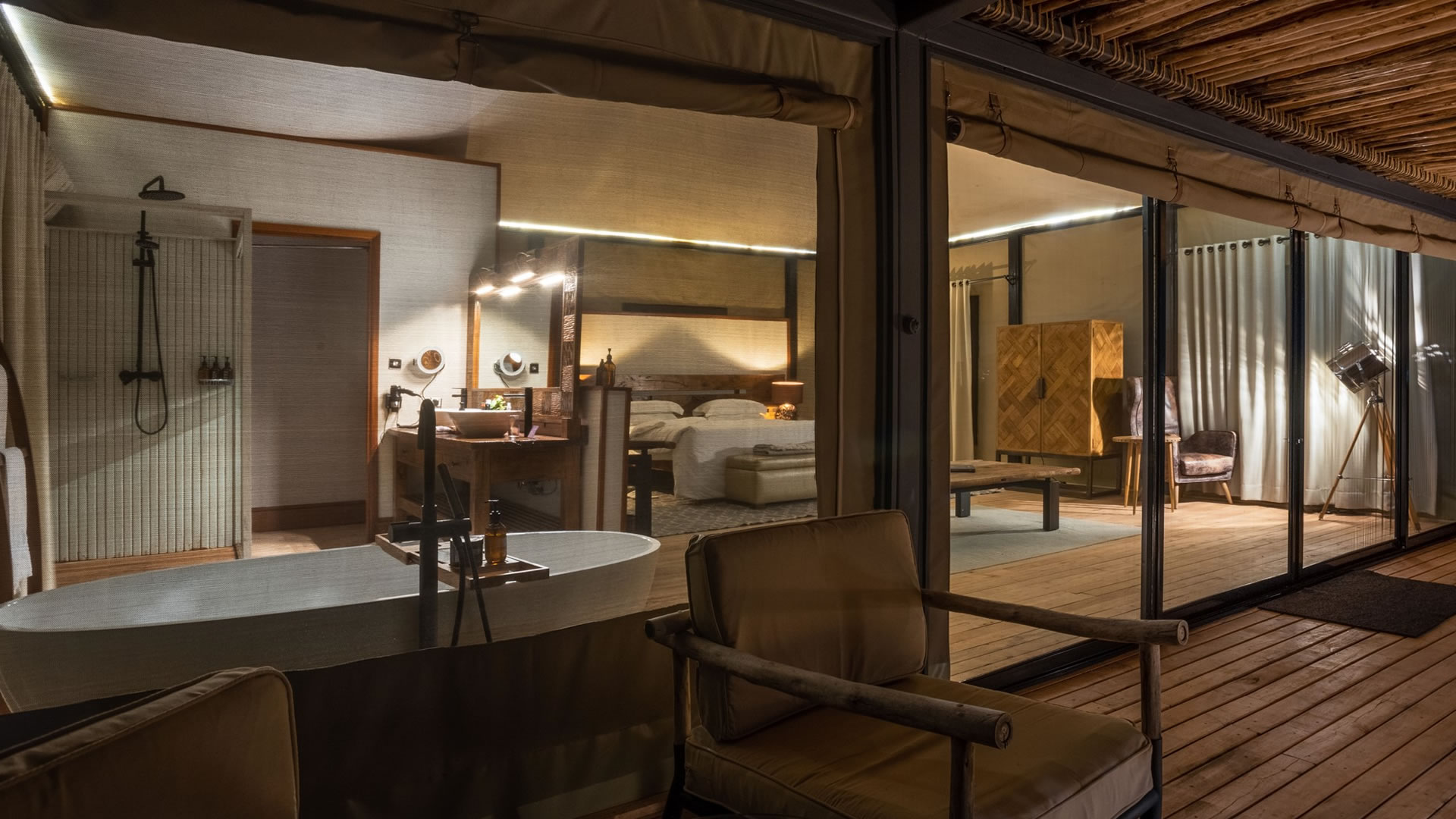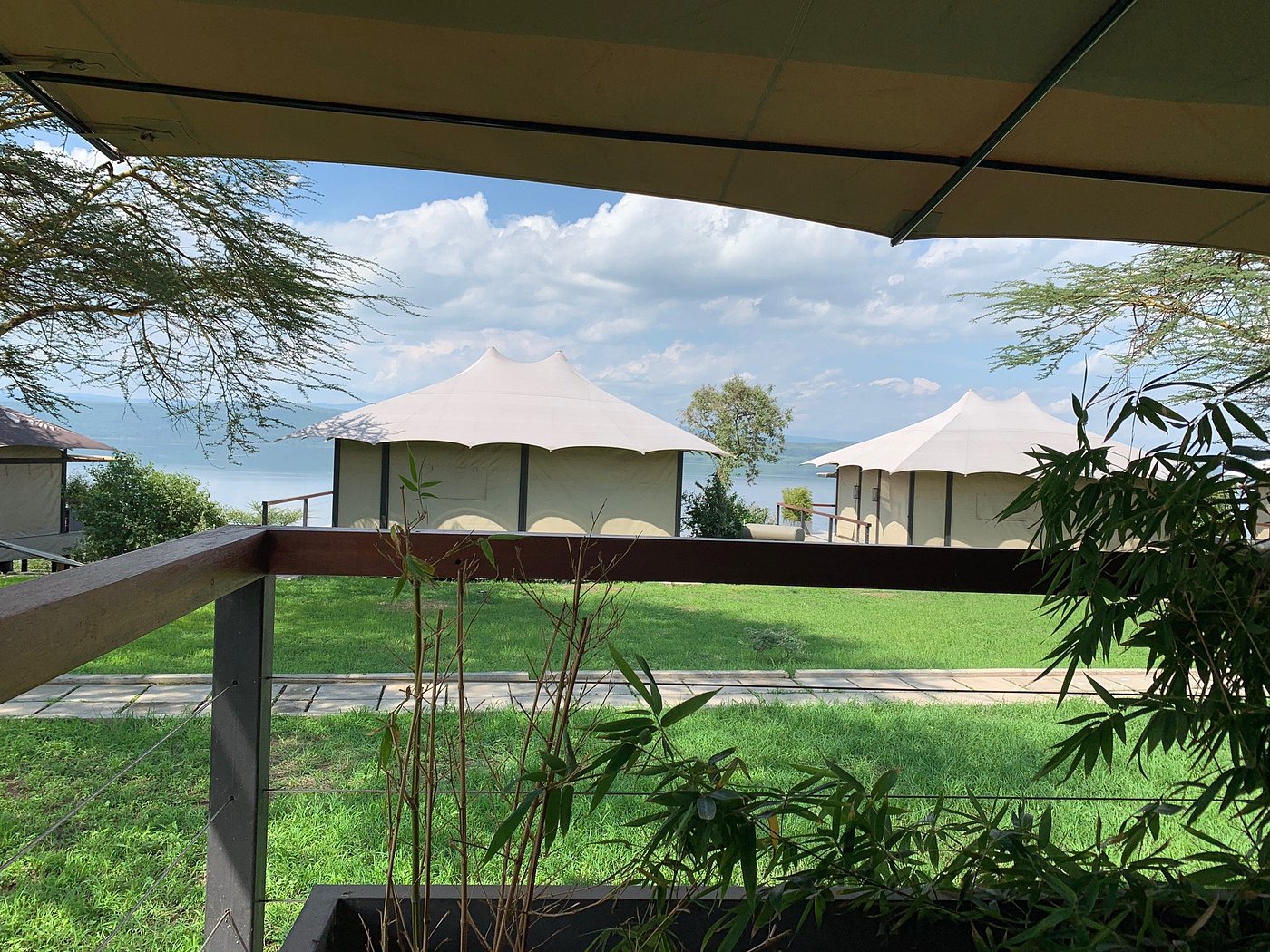 - Luxury Tented Suites with king beds, private decks, and panoramic lake views